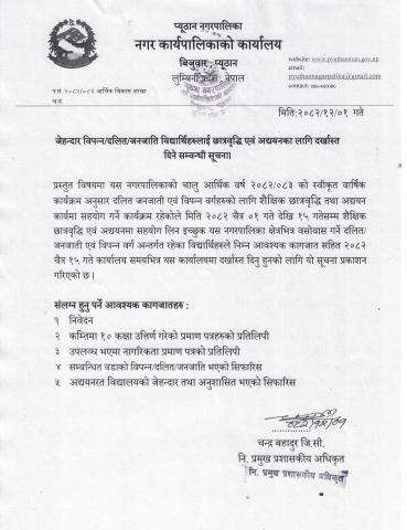 जेहन्दार विपन्न / दलित / जनजाति विद्यार्थीहरुलाई छात्रवृद्धी एवम् अध्ययनका लागि दरखास्त दिने सम्बन्धी सूचना !!