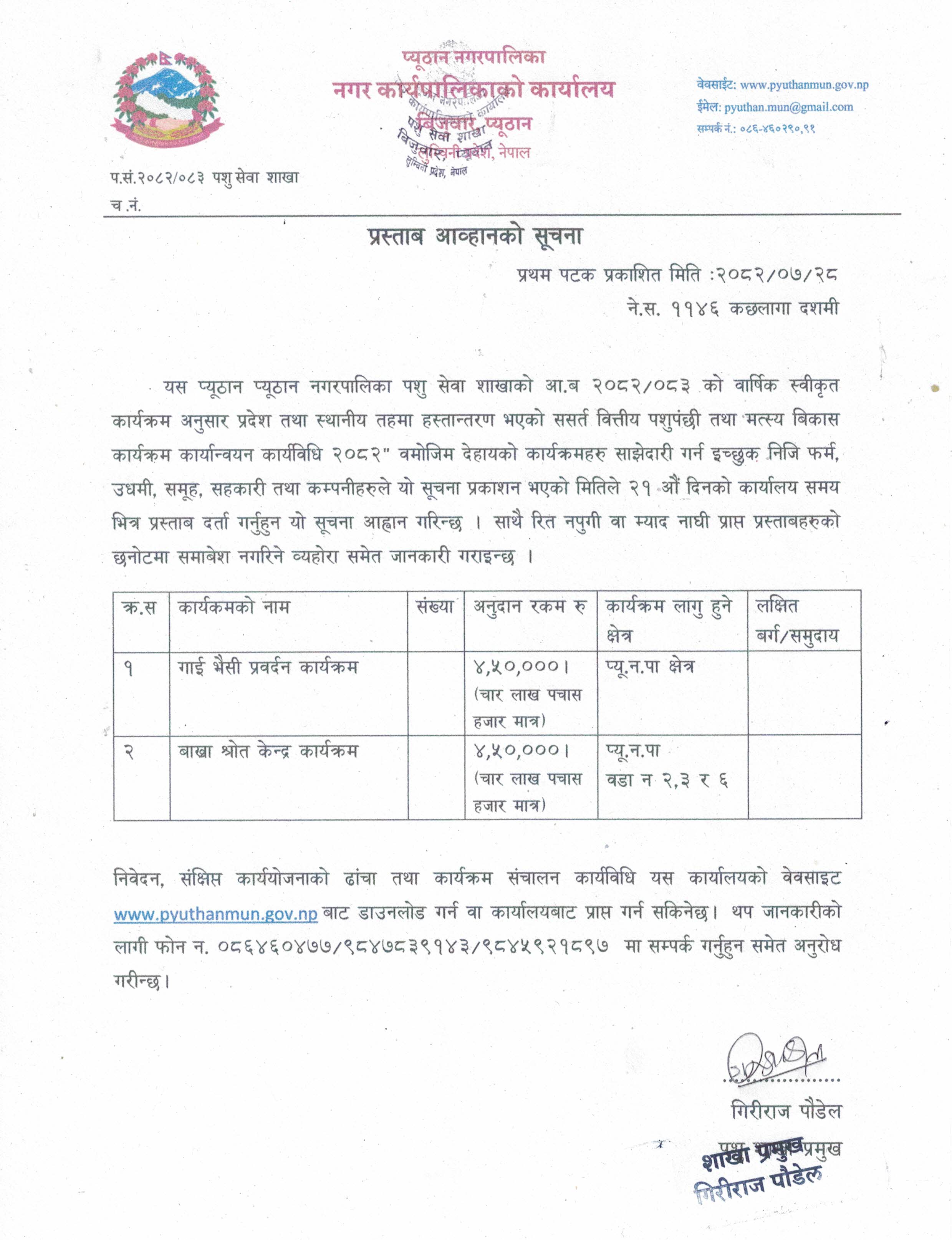 गाई भैसी प्रवर्द्धन कार्यक्रम र वाख्रा श्रोत केन्द्र कार्यक्रम संचालनका लागि प्रस्ताव आह्वान गर्ने सूचना