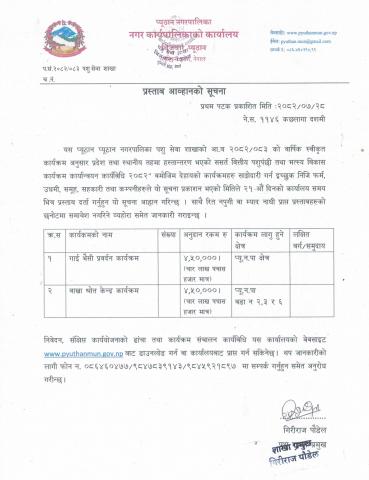 आर्थिक वर्ष २०८२/०८३ को संघीय शशर्त अनुदान अन्तर्गतका तपसिलका विभिन्न कार्यक्रमहरुमा प्रस्ताव आह्वान गर्ने सम्बन्धि सूचना !!!!!