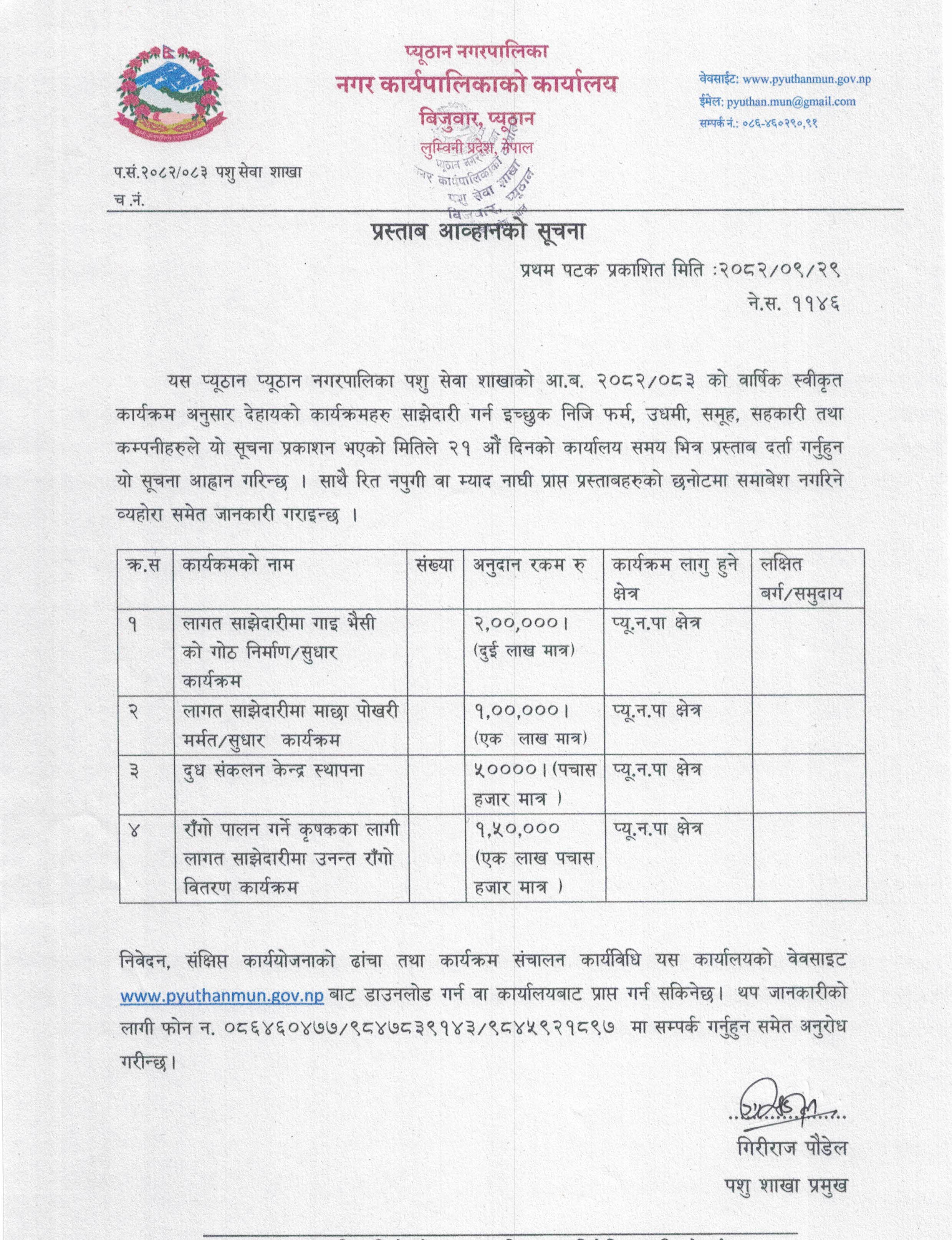 पशु सेवा शाखा अन्तर्गतका विभिन्न कार्यक्रमका लागी प्रस्ताव आह्वानका लागि सूचना !!