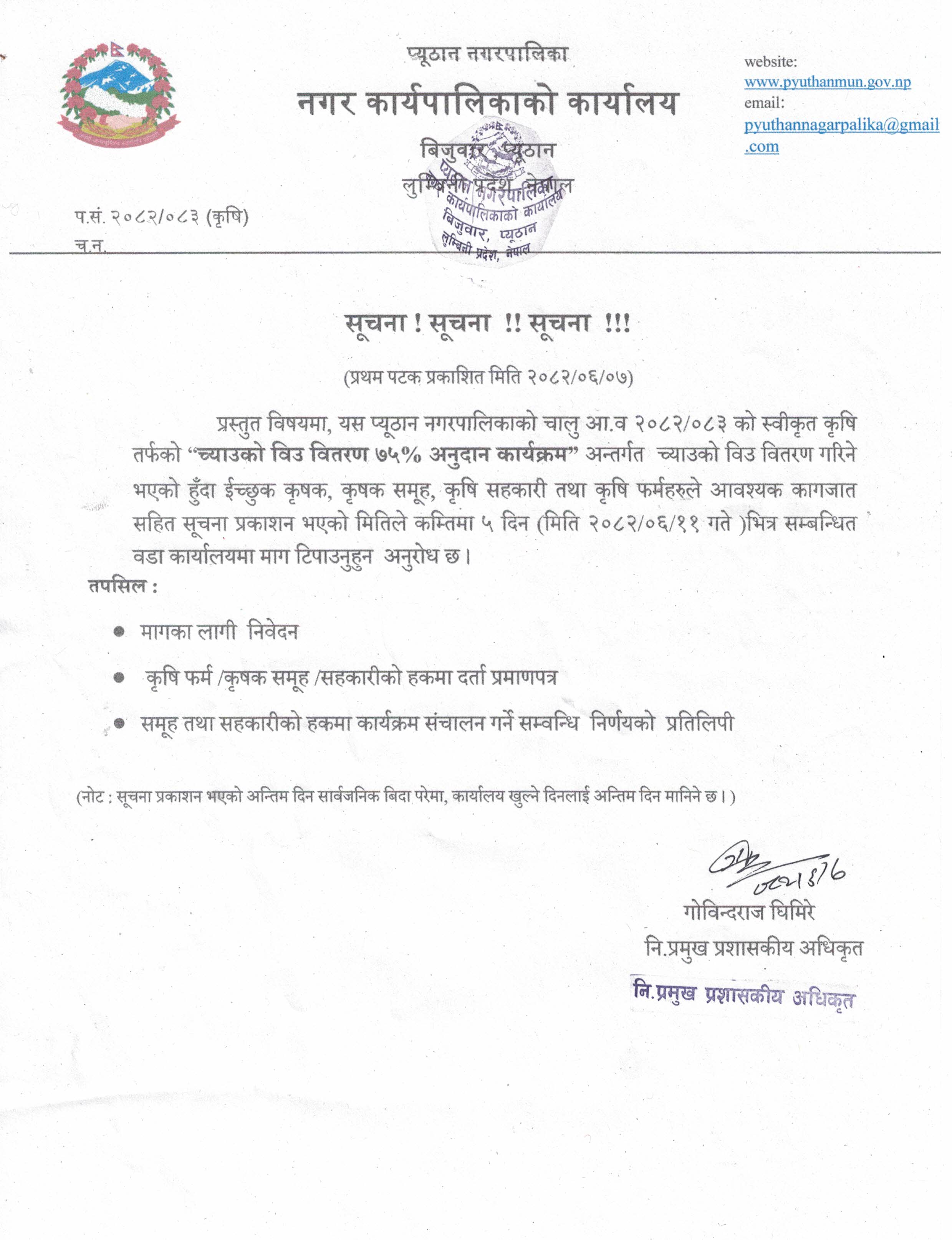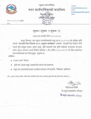 ७५ प्रतिशत अनुदानमा च्याउको विउ वितरण कार्यक्रम सम्बन्धि सूचना । ईच्छुक कृषकहरुला आ-आफ्नो वडा कार्यालयमा माग टिपाउनुहुन अनुरोध छ ।