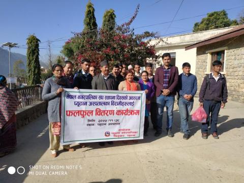 नेपाल नगरपालिका संघ स्थापना दिवसको अवसरमा प्यूठान अस्पतालका विरामीहरुलाई फलफुल वितरण कार्यक्रममा सहभागी जनप्रतिनिधिहरु तथा कर्मचारीहरु ।