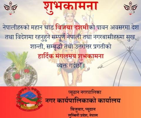 नेपालीहरुको महान चाड विजया दशमी २०८२ को पावन अवसरमा देश तथा विदेशमा रहनुहुने सम्पूर्ण नेपाली तथा नगरबासीहरुमा सुख, शान्ती, सम्बृद्धी तथा उत्तरोत्तर प्रगतीको हार्दिक मंगलमय शुभकामना व्यक्त गर्दछौँ ।