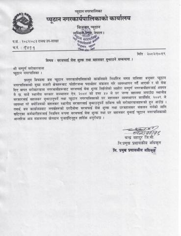 सरसफाई सेवा शुल्क तथा बहालकर बुझाउने सम्बन्धमा ।
