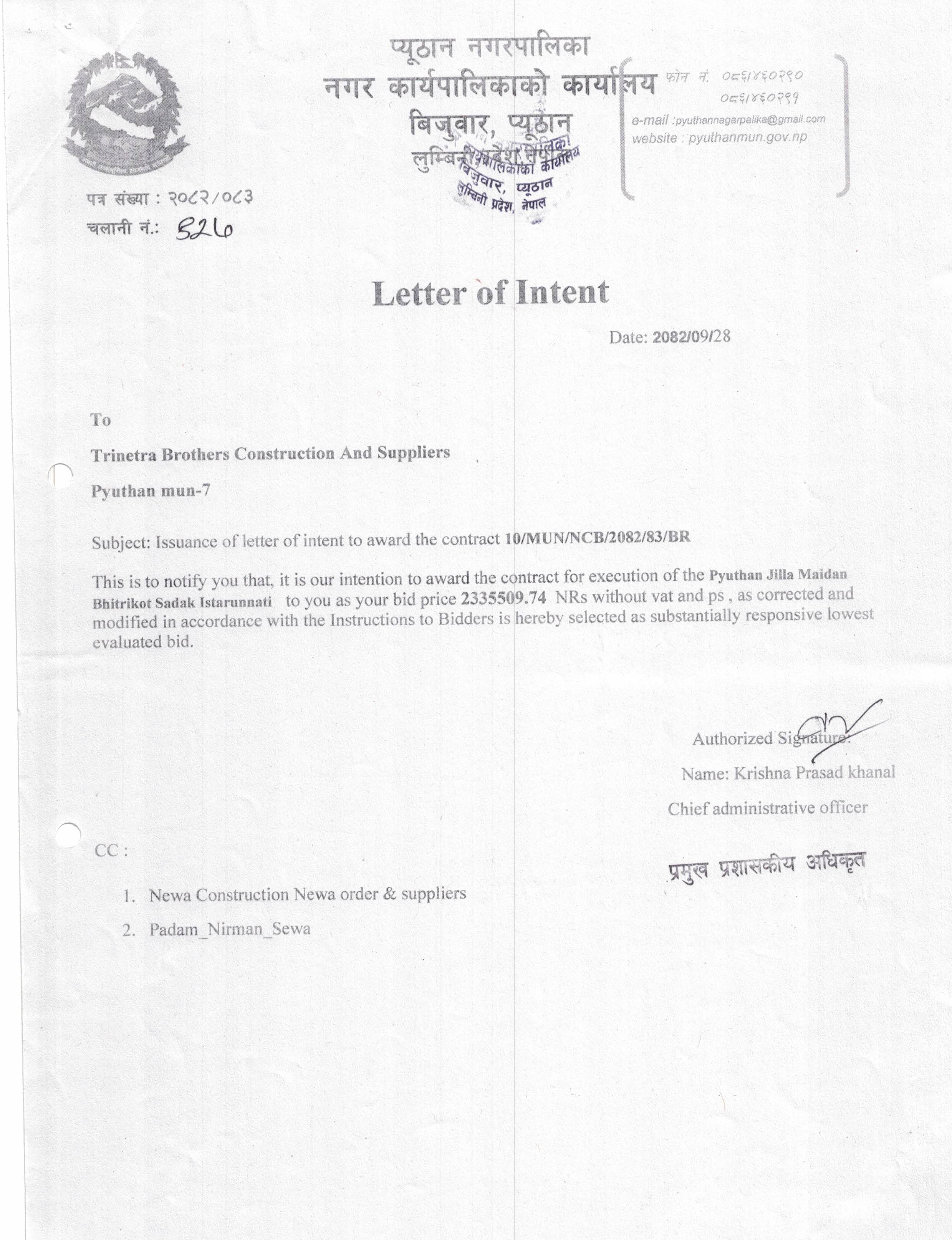 Letter of Intent Contract num 11/Mun/NCB/2082/83/WS